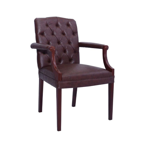 Traditionally inspired. Shallow button tufts, dignified pleating, and exquisitely-carved legs & Arms are punctuated by dark brown polish. Product Details Structure made of solid wood Upholstered Seat & Back Features Product Type Visitor Chair Upholstery...